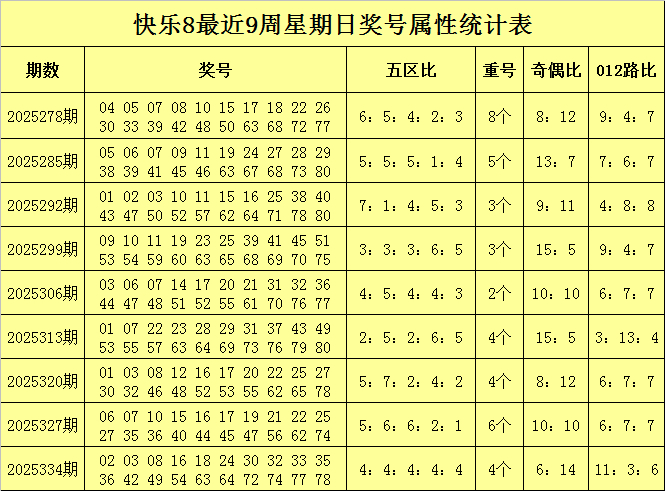 福彩风物8第2025334期(上周日)奖号总结:02 03 08 16 18 24 30 32 33 35 36 42 49 54 63 64 72 74 77 78,其中奖号奇偶比为6:14,五区比为4:4:4:4:4,012路比为11:3:6,包含4个重号16、35、36、74。